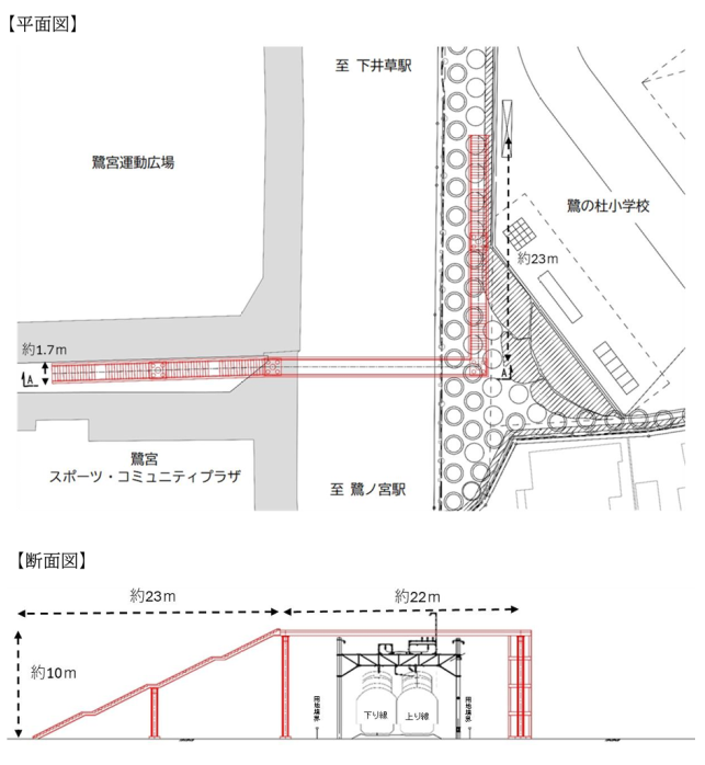 跨線橋について、設計概要が見えてきましたので今年春の資料でご報告します。添付の図面のとおり高さ10M以上の構造物となり、建物の階段で言えば約5階分に相当します...(2025/10/26)